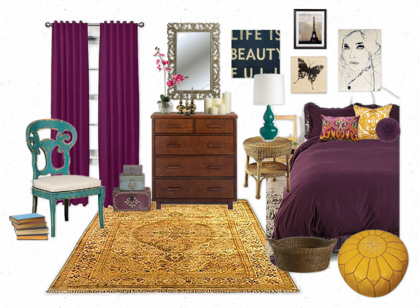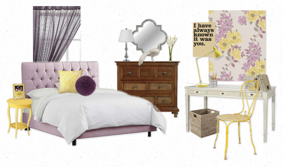 In this board, I created a more shabby chic feel. Adding lavender and pale yellow to the dark purple theme brings in sunny cheer. Painted thrifted furniture creamy white or sunny yellow. Cover a large piece of cork with pretty purple and yellow floral wallpaper or fabric for a lovely inspiration board above your desk. The dark purple and a bit of dark wood tones keep things grounded---and keeps the space from looking like a little girl's bedroom. Mix well-worn vintage pieces (an old chair, antique desk) with new, luxurious pieces (tufted, upholstered headboard and sparkly mirror). The color combination is so fresh, fun, and flirtatious.