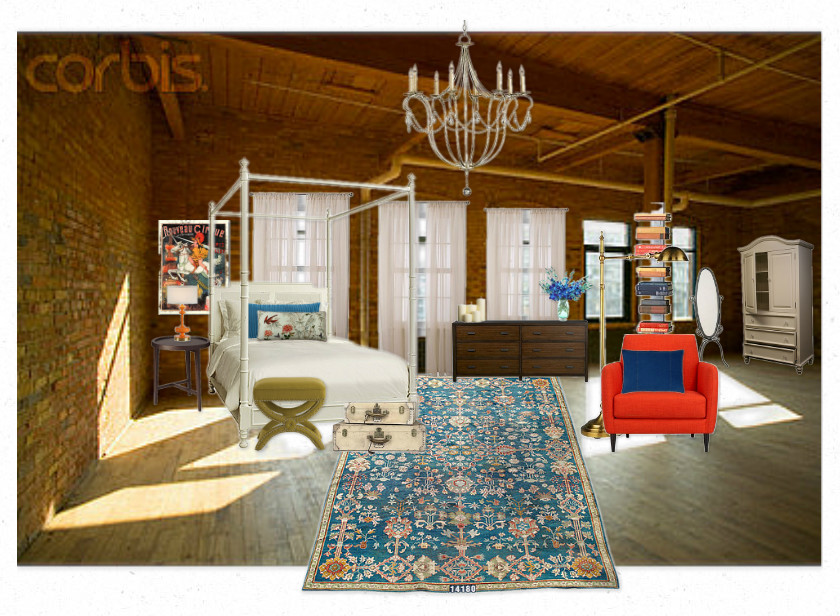 You know me and exposed brick... it's a decor love affair. The board above depicts what is pretty much my dream bedroom. Exposed brick walls all the way around. Exposed wooden beams on the ceiling. A perfectly worn wood floor. I love four-poster beds and this white one feels modern and vintage-y at the same time. A vibrant blue pillow and lovely floral one add color and pattern. Nearby, a round side table holds a bold orange lamp. A colorful vintage poster hangs overhead. At the foot of the bed is a velvet bench in a crisp green color as well as a couple off-white vintage suitcases stacked on top of each other. The focal point of the room is a big oriental rug in a gorgeous blue and boasting an intricate floral print. A dark, modern dresser is kept clutter-free, accessorized with only a cluster of candles and a vase of blue flowers. Books are stacked vertically along one of the wooden columns. A bright orange-red chair and brass floor lamp make for a cozy reading spot. In the background is a French Provincial armoire and antique mirror. Simple white sheers cover the windows and a dainty chandelier illuminates everything from above.